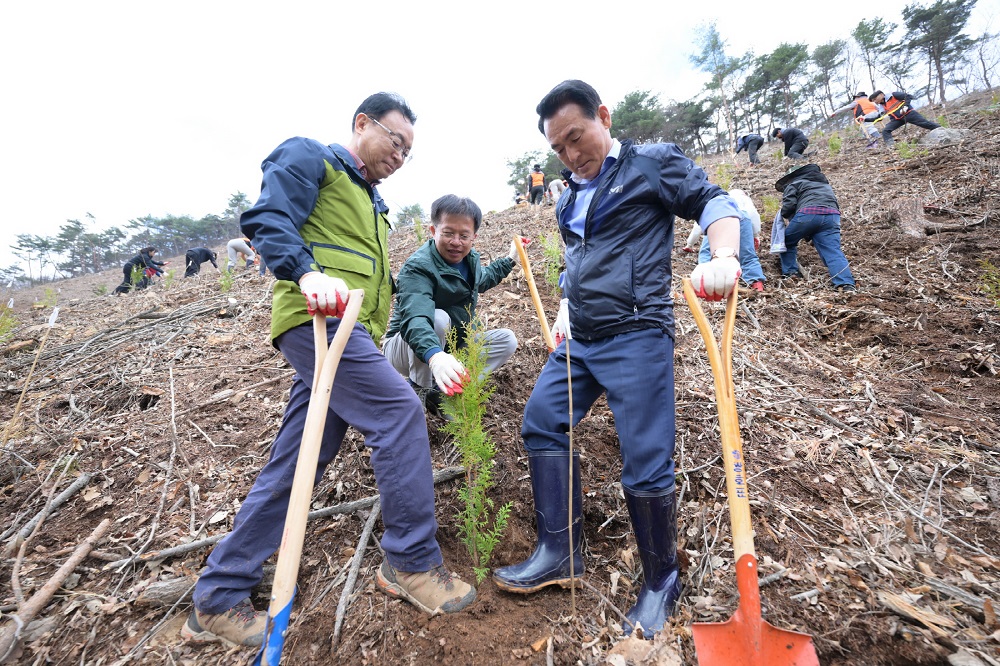 이날 행사에는 공무원과 유관기관 관계자 등 400여 명이 참여해 구역별로 나뉘어 편백나무 3,000그루를 식재하며 산림의 가치와 탄소중립 실천의 중요성을 되새겼다.