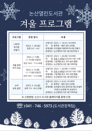 겨울철 독서프로그램의 일시ㆍ장소 등 정보와 신청법 등 자세한 사항은 논산시 도서관 홈페이지(lib.nonsan.go.kr)에서 확인할 수 있으며, 논산시 도서관정책팀(☏041-746-5973)을 통해 안내받을 수 있다.