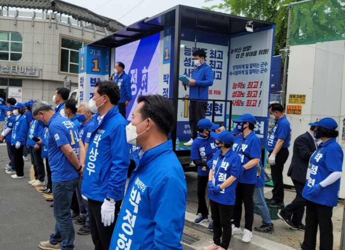 6.1지방선거에 출마하는 박정현 부여군수 후보가 오늘(19일) 오전 부여시내버스 터미널에서 지지자와 군민 등이 대거 지켜보는 가운데 선대위 출정식을 갖고 본격 유세전을 시작했다.