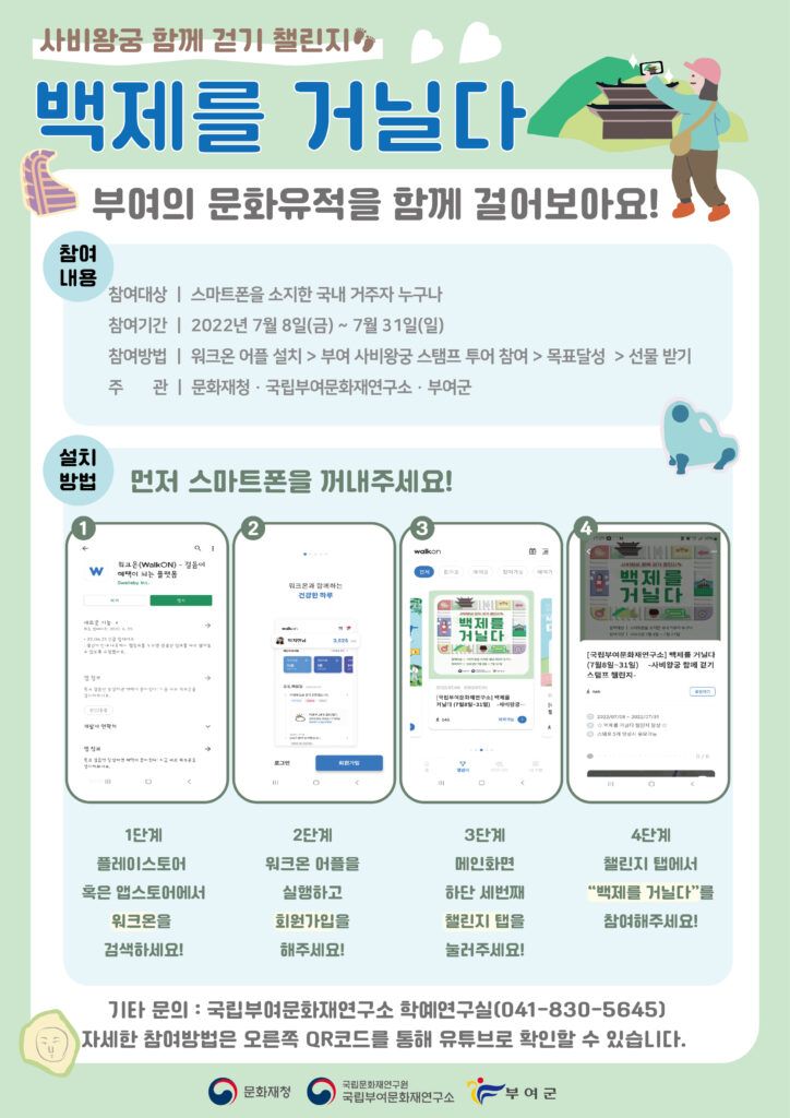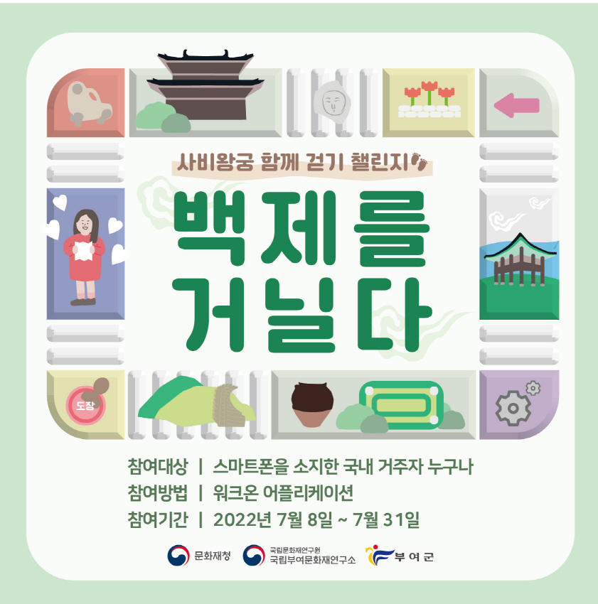 올해 처음으로 추진하는 행사로 헬스케어 플랫폼 ‘워크온’을 활용해 스탬프 투어 방식으로 진행된다. 코로나19로 지친 시민들이 마음을 치유하고 건강을 증진시키는 동시에 백제문화유산주간에 맞춰 부여 사비왕궁지구 유적을 널리 홍보하기 위해 마련된 행사다. 백제역사유적지구가 2015년 7월 세계유산으로 등재된 것을 기념한다는 의미도 담았다.