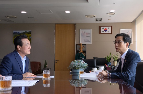 백성현 논산시장이 20일 오전 한 훈 농림축산식품부 차관을 만나 ‘탄소중립형 청정축산단지 조성사업’의 구체적 추진 방향을 설명하며 축산 당국의 적극적 지원을 요청했다.