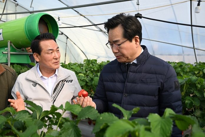 백성현 논산시장, 정황근 농림축산식품부 장관과 딸기 재배 현장 시찰