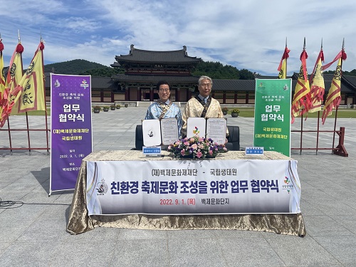 백제문화제재단(대표이사 신광섭)과 환경부 산하 국립생태원(원장 조도순)이 친환경 생태축제 확산 및 공동 마케팅 추진을 위한 업무 협약식을 지난 1일 부여 규암면 소재 백제문화단지 내 천정전에서 개최했다.