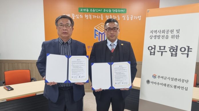 부여군시설관리공단(이사장 윤상철)은 최근 아마추어 태권도 챔피언십(대표 곽정국)과 업무협약을 체결했다.