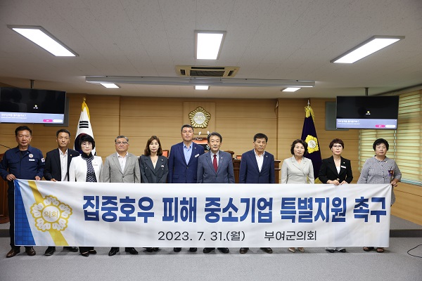 또한, 부여군의회는 박상우 의원을 대표로 하여 군의원 전원이 발의한 『집중호우 피해 중소기업 특별지원 촉구 건의안』을 안건으로 상정해 채택했다. 건의안에서 정부를 향해 지난 7월 13일부터 내린 집중호우로 인해 관내 중소기업의 기계설비, 원자재 등 3,721백만원 상당의 피해가 발생하였으나, 특별재난지역 선포에도 불구하고 긴급경영안정자금 등 간접 지원만 있을 뿐 중소기업의 실질적 피해 회복을 위한 직접적인 지원기준이 전무함을 지적하며, △「재난 및 안전관리 기본법」의 재난지역 내 피해 중소기업에 대한 국고 보조 등 지원 방안 마련 및 관련법 개정 촉구 △재해로 피해를 입은 중소기업 구호 및 경영안정 직접 지원 근거 마련을 적극 건의하였다.