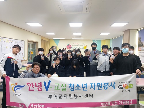 부여군자원봉사센터는 지난 27일 임천중학교를 방문해 청소년 자원봉사 활성화를 위한 ‘안녕 V-교실’ 청소년 자원봉사를 전개했다.