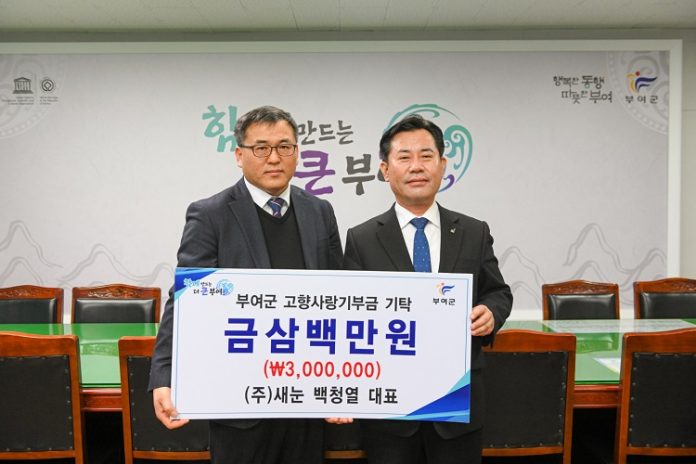 지난 21일 ㈜새눈 백청열 대표가 부여군에 방문해 고향사랑기부금 300만원을 쾌척하여 부여군 고향사랑기부제의 정착에 힘을 보탰다.