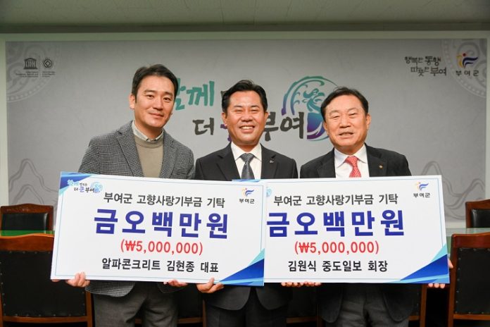부여군, 고향사랑기부제 ‘고향사랑은 부전자전’-중도일보 김원식 회장, 알파특수콘크리트(주) 김현종 대표 각각 500만원씩 기부-
