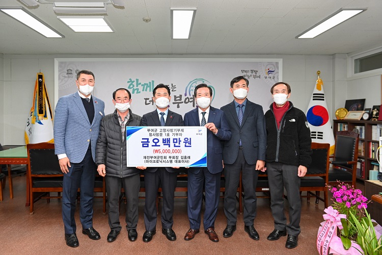 지난 2일 군수실에서는 재전부여군민회 부회장이자 방송·음향 전문기업인 마이크로닉시스템 대표이사인 김홍래 부회장이 부여군 1호 기부자로 나섰다. 김홍래 부회장은 부여 발전과 주민 복리를 위해 고향사랑기부제 1년 최대 기부액인 500만원을 박정현 군수에게 전달했다.
