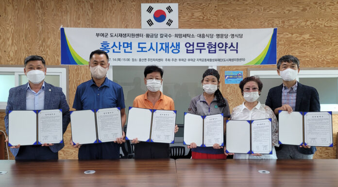 부여군 도시재생지원센터는 지난 14일 홍산시장로 일대 5개 점포와 업무 협약식을 진행했다.