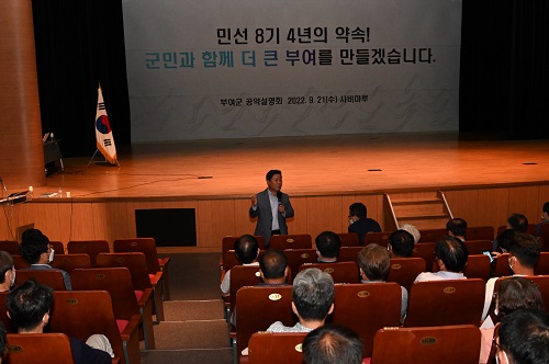부여군(군수 박정현)이 지난 21일 국립부여박물관 사비마루에서 지역주민과 공직자 300여 명이 참석한 가운데 ‘민선 8기 공약 군민설명회’를 개최했다.