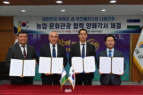 부여군(군수 박정현)이 최근 우즈베키스탄 나망간주(누리디노프 보티르존 카다르카노비치 부주지사 등 3인)와 농업 및 문화관광 분야 협력을 위한 양해각서(MOU)를 체결했다.