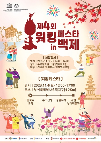 부여군(군수)이 11월 가을 단풍을 즐기며 부여군의 역사와 문화 속을 걸어보는 ‘제4회 워킹페스타 in 백제’ 걷기 축제를 내달 4일에 개최한다.
