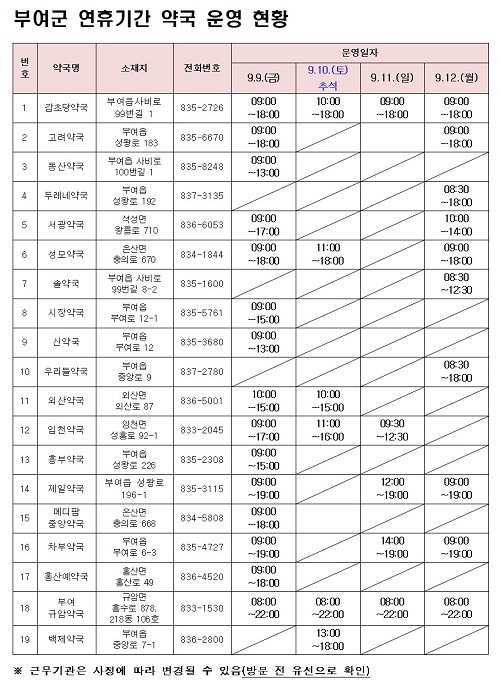 건양대 부여병원 응급실을 24시간 운영해 응급환자에 대비하고, 보건소와 관내 병·의원 18개소, 약국 19개소를 지정된 일자별로 운영할 계획이다. 의료기관이나 약국을 방문하기 어려운 경우엔 24시간 운영 편의점에서 안전상비의약품(해열제, 소화제 등)을 구매할 수 있다.
