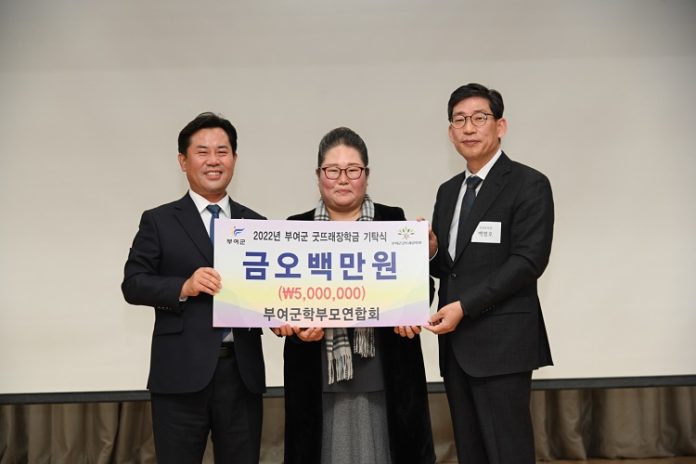 부여군 학부모협의회(회장 이수진)가 최근 개최된 2022년 사업 성과 공유회 및 장학금 전달식에서 (재)부여군굿뜨래장학회(이사장 박정현)에 장학금 5백만원을 기탁했다.