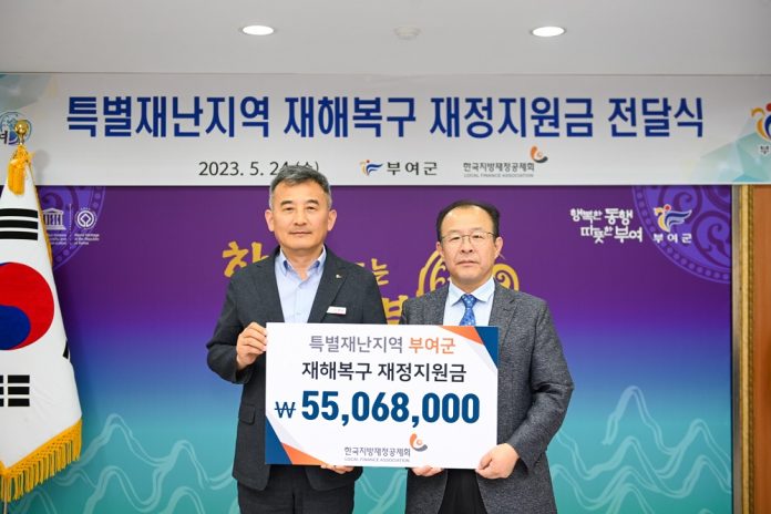 부여군(군수 박정현)은 지난 24일 한국지방재정공제회가 특별재난지역 재해복구 재정지원금 5,500만원을 전달했다고 밝혔다.