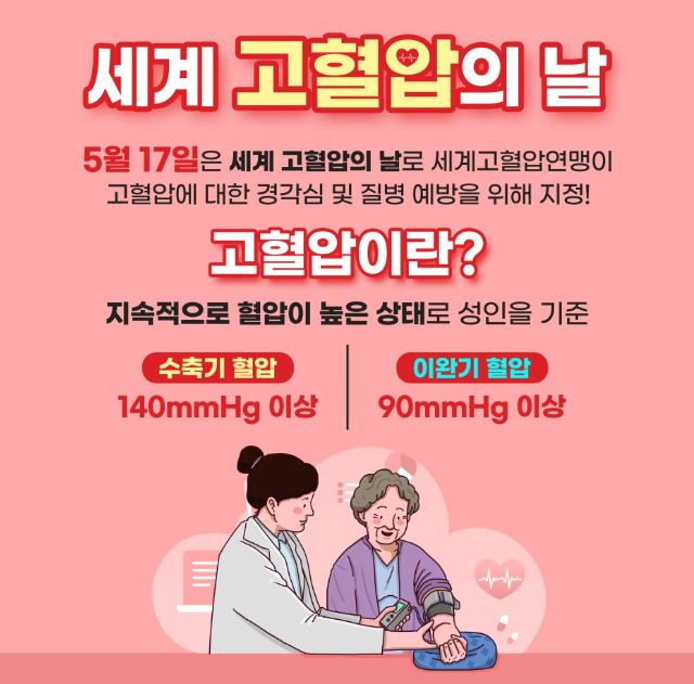 이상각 보건소장은 “고혈압 예방관리를 위해 혈압 수치를 정확히 인지하고 식이조절과 운동을 꾸준히 실천하시길 바란다”며 “앞으로도 지역주민에게 고혈압에 관한 올바른 정보와 다양한 서비스를 제공하여 고혈압 예방 활동에 최선을 다하겠다”고 밝혔다.