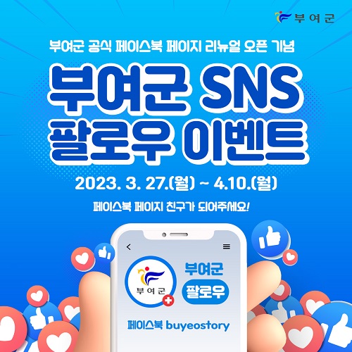 부여군(군수 박정현)이 페이스북 리뉴얼을 기념해 4월 10일까지 구독자 증가와 채널 홍보를 위한 ‘SNS 팔로우 이벤트’를 개최한다.