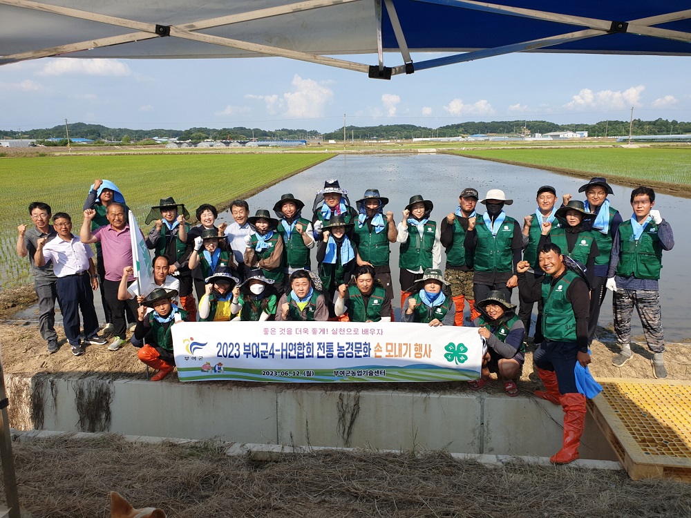 부여군4-H연합회(회장 이민구)는 지난 12일 부여군 임천면 칠산리 일원에서 ‘전통 농경문화 손 모내기 행사’를 추진했다.