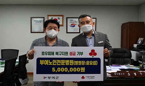 부여 규암면에 위치한 부여노인전문병원(병원장 윤요셉)이 최근 집중호우로 수해를 입은 주민들을 위해 성금 500만원을 부여군에 기탁했다.