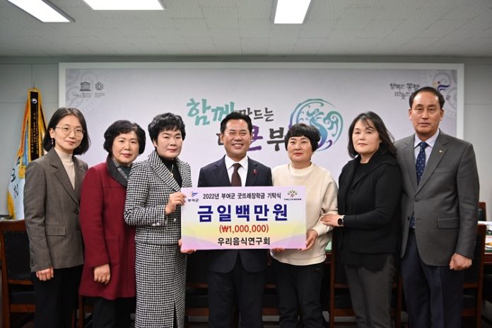 우리음식연구회(회장 김문희)가 지난 28일 부여군청을 찾아 지역인재 육성을 위한 장학금 100만원을 부여군굿뜨래장학회(이사장 박정현)에 기탁했다.