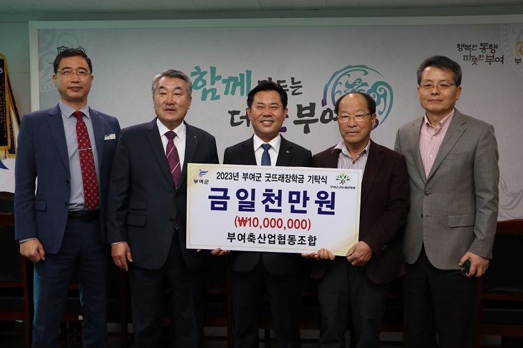 부여축산업협동조합(조합장 정만교)은 최근 임원진과 함께 부여군청을 방문해 지역인재 육성 장학금 1,000만원을 (재)부여군굿뜨래장학회(이사장 박정현)에 기탁했다.