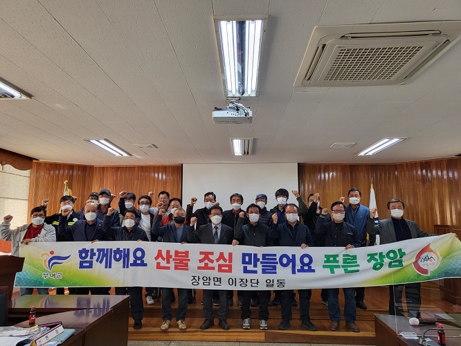 부여군 장암면(면장 윤상철)은 지난 3일 장암면행정복지센터 2층 회의실에서 이장, 관계 공무원 등 30여 명이 참석한 가운데 2022년 가을철 산불예방 결의대회를 열었다.
