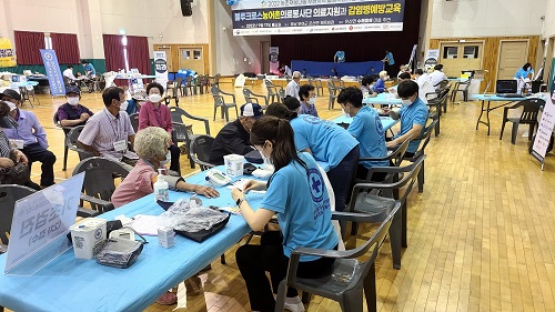 블루크로스의료봉사단이 지난 17일 은산면체육회관에서 수해피해로 지친 은산면 주민들을 위해 무료진료 및 감염병 예방교육 활동에 나섰다.