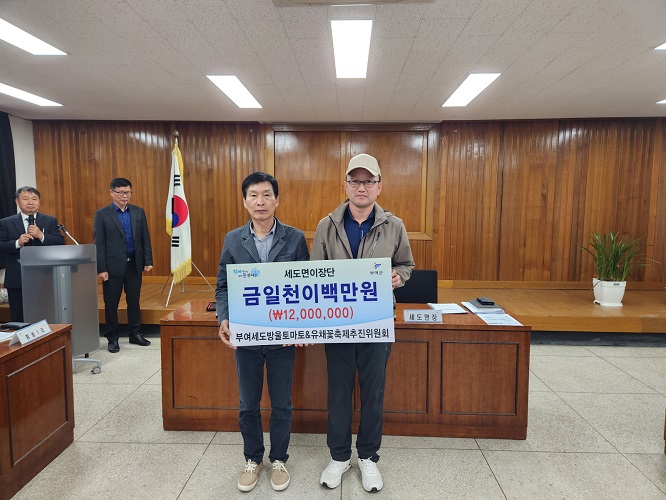 부여군 세도면(면장 구자건)은 오는 21일 2023년 부여세도 방울토마토&유채꽃축제(이하 방울토마토&유채꽃축제) 개막을 앞두고, 세도면 이장단에서 축제 발전기금으로 1,200만원(일천이백만원)을 쾌척했다고 밝혔다.