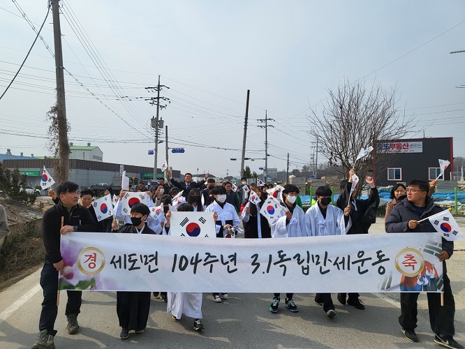세도면민회에서는 150여명의 면민들이 모인 가운데 ‘3.1독립만세운동 104주년 추모식’을 열고, 애국열사들의 숭고한 정신을 기리기 위해 독립선언문 낭독, 행렬, 헌화와 묵념, 만세삼창을 외쳤다.