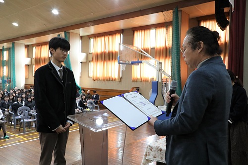 4일 오전 10시 30분 본교 체육관에서 개최된 입학식에서 총동창회와 동문들이 전달한 장학금은 천원으로 전하는 후배 사랑 장학금에 참여한 동문들의 총동창회 장학금(1명 100만원)을 비롯해 1회 동문들의 사랑이 담긴 유미선, 이종순, 정여성 장학금(3명 150만원), 8회 동창회(1명 100만원), 박정진 교사의 후학 양성에 깊은 뜻을 기린 박정진 장학회(7명 500만원) 등이다.