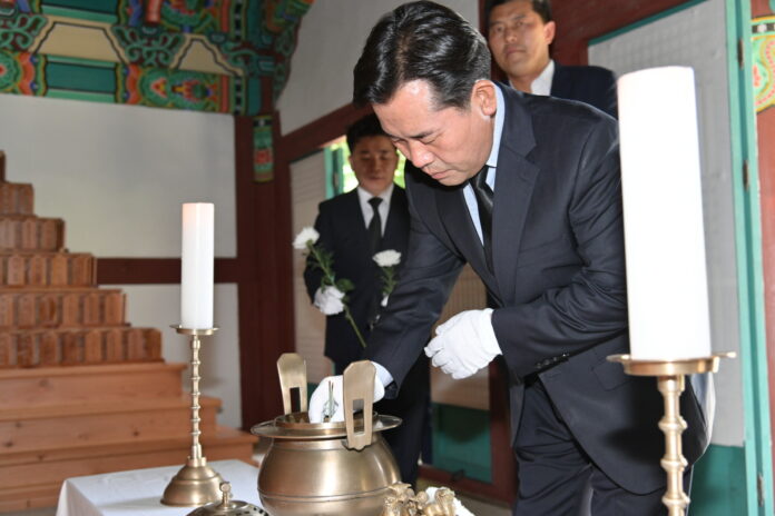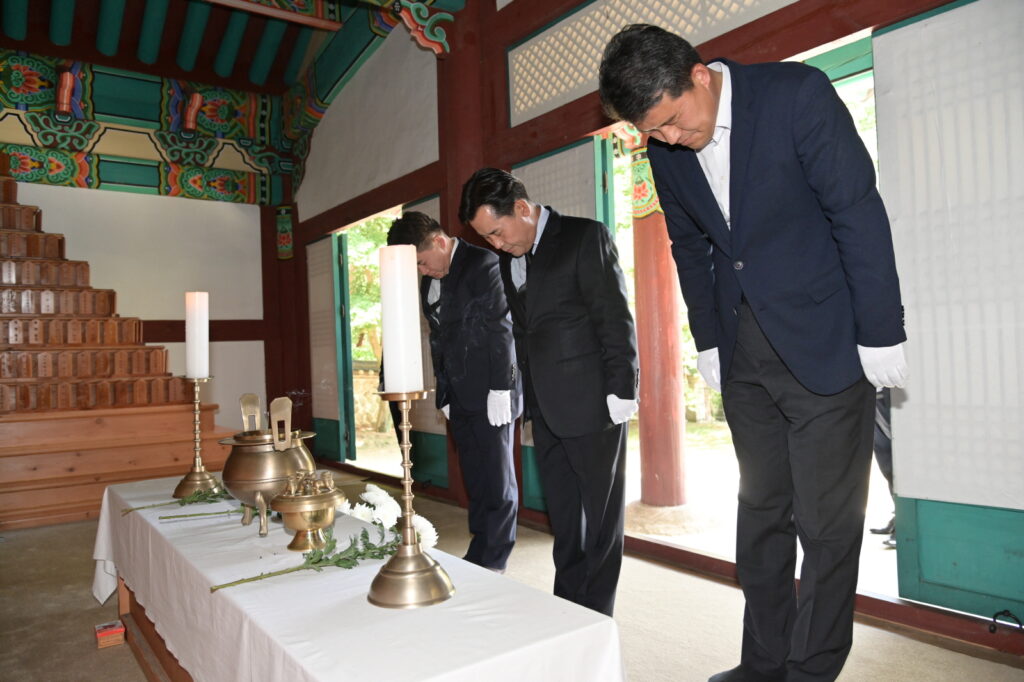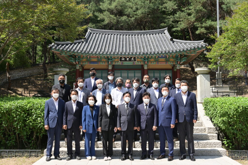 제8회 전국동시지방선거에서 재선에 성공한 박정현 부여군수 당선인이 2일 오후 더불어민주당 부여군의원 당선자들과 함께 충령사를 찾아 참배하고 있다.