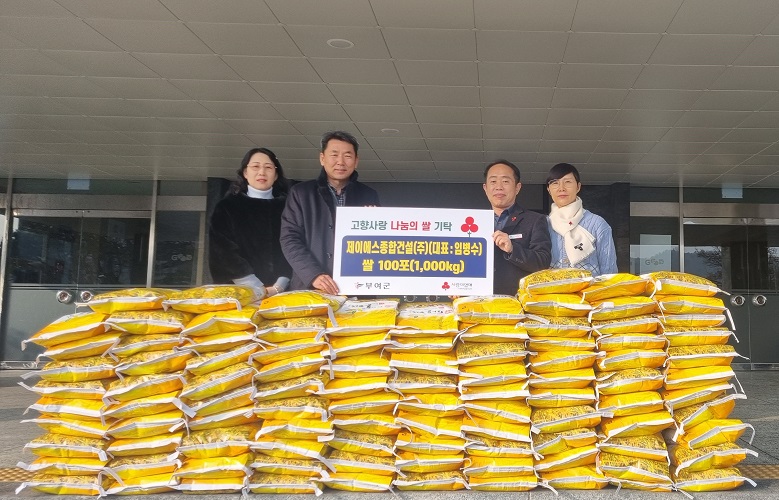 천안에 소재한 제이에스 종합건설㈜(대표 임병수)이 지난 28일 부여군청을 찾아 필요한 이웃을 위해 써달라며 쌀 100포(1,000kg)를 기탁했다.