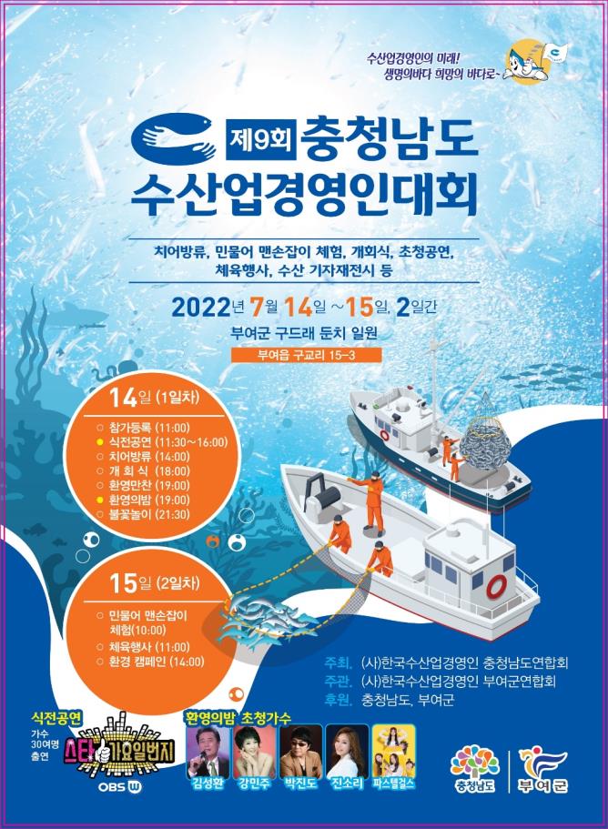 충청남도 수산업 경영인들의 축제 한마당인 ‘제9회 충청남도 수산업경영인대회’ 개회식이 14일 부여군 구드래 둔치 일원에서 열린다.