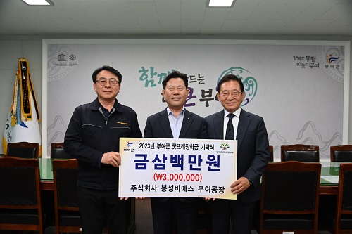 주식회사 봉성비에스 부여공장(대표 김춘영)은 최근 부여군청을 방문해 지역 향토인재 육성을 위한 장학금 300만원을 (재)부여군굿뜨래장학회(이사장 박정현)에 기탁했다.