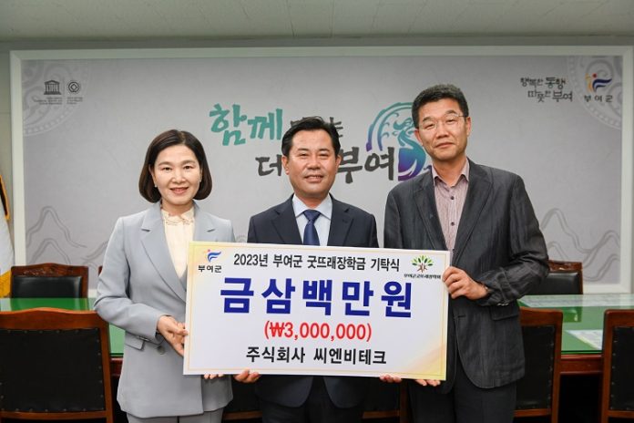 주식회사 씨엔비테크(대표 권영희)는 최근 부여군청을 방문해 지역 인재 육성을 위한 장학금 300만원을 (재)부여군굿뜨래장학회(이사장 박정현)에 기탁했다.