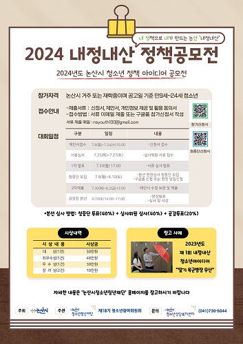 ‘2024년 내 정책으로 내가 만드는 논산 「내정내산」’공모전은 논산시에 거주하거나 시 소재의 학교에 다니고 있는 9~24세 청소년이라면 누구나 참여 가능하며, 개인 또는 4명 이내의 팀으로 지원하면 된다.