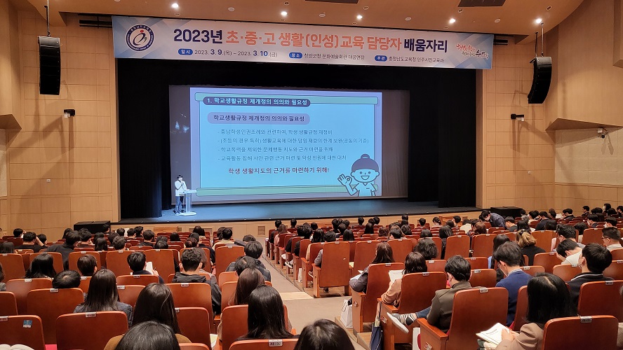 9일(목)과 10일(금) 이틀간 청양군청 문화예술회관 대강당에서 도내 초·중·고등학교 교사 751여 명이 참석한 가운데 열린 이번 배움자리에서는 ▲학기 초 관계중심 학급 세우기 ▲교육공동체가 함께 만드는 학교생활 규정 ▲관계중심 생활교육 실천을 위한 사례 공유 ▲인성교육과 연계한 생활교육 ▲학교폭력 및 탈선, 안전사고, 도박 예방 ▲음주, 흡연, 성폭력, 사이버 성범죄 등의 예방 교육 ▲생명존중 및 위기학생 관리 지원 등에 대해 폭넓게 알아보는 시간을 가졌다.