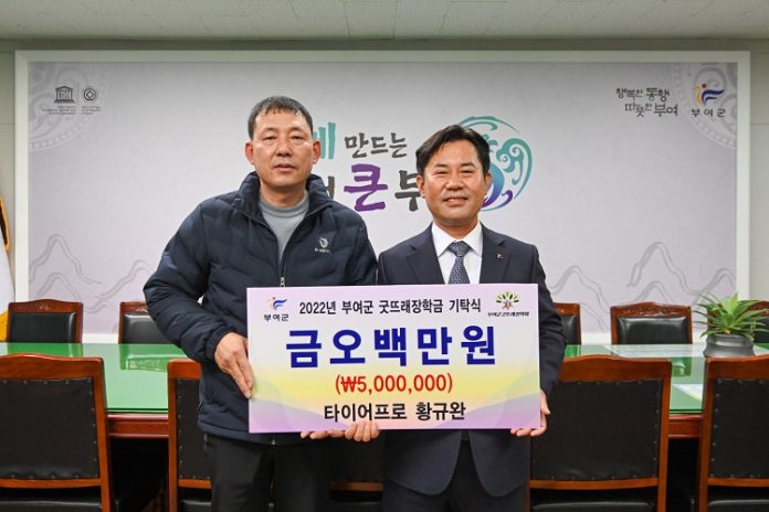 타이어프로 부여점(대표 황규완)이 지난 7일 부여군청을 찾아 지역인재 육성에 사용해달라며 장학금 500만원을 부여군굿뜨래장학회(이사장 박정현)에 기탁했다.