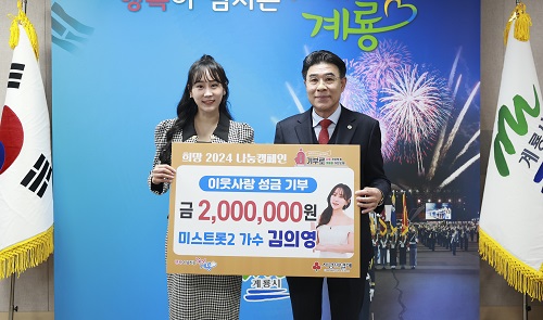 트롯가수 김의영, 계룡시에 이웃돕기 성금 200만 원 기탁 지역계룡 2024년 1월 16일 계룡시(시장 이응우)는 트롯가수 김의영이 이웃돕기 성금 200만 원을 기탁해 왔다고 밝혔다. 김의영 가수는 “그동안 받은 사랑을 돌려드린다는 마음으로 성금 기부를 결정했으며, 어려운 분들께 작은 도움이 되기를 바란다”고 전했다. 이응우 시장은 “소중한 성금을 기탁해 주신 김의영 님께 진심으로 감사드리며, 성금은 기탁자의 소중한 마음을 담아 도움이 필요한 이웃에게 전달하겠다”고 말했다. 답변을 남겨주세요 답글 취소 귀하의 의견을 입력하십시오! 여기에 이름을 입력하십시오. 잘못된 이메일 주소를 입력하셨습니다! 여기에 이메일 주소를 입력하십시오. 의견을 작성하려면 저장해주세요. Δ 최근기사 논산 “논산의 미래, 반드시... inbctv - 2026년 3월 26일 논산 “안전은 타협 없다”…... inbctv - 2026년 3월 25일 논산 논산딸기, 산업으로 뛴다…... inbctv - 2026년 3월 25일 논산 논산시, 대상포진 무료접종…... inbctv - 2026년 3월 25일 인기기사 계룡 행복이 넘치는 Yes!... inbctv - 2020년 11월 9일 논산 시민 모두의 평생학습을... inbctv - 2022년 2월 3일 계룡 계룡시, 제18회 국방일보... inbctv - 2022년 9월 27일 계룡 계룡시 엄사면 도자기... inbctv - 2022년 5월 27일 배너 논산 육군병장 논산시 농산물 브랜드 0 뿌리가 든든한 금융 MG 놀뫼새마을금고 0 충청남도논산계룡교육지원청 0 관련뉴스 논산 “방심은 곧 재난…산불, 이제는 ‘개인의 책임’이다”논산시장 경고…“예방 실패는 곧 피해로 직결된다 inbctv - 2026년 3월 26일 논산 “논산의 미래, 반드시 결과로 증명하겠습니다” inbctv - 2026년 3월 26일 논산 “안전은 타협 없다”… 논산딸기축제, 현장 중심 안전관리 총력 inbctv - 2026년 3월 25일 논산 논산딸기, 산업으로 뛴다… 10개 기업과 손잡고 ‘K-딸기’ 세계화 inbctv - 2026년 3월 25일