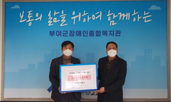 한국농어촌공사 부여지사(지사장 김은수)는 최근 부여군장애인복지관에 방문하여 지역 장애인을 위한 후원금으로 온누리상품권 50만원을 전달했다.