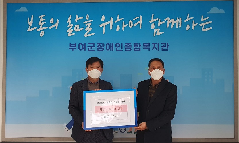 박종화 부여군장애인종합복지관장은 “부여군 장애인들을 위해 저희 복지관을 방문하여 기부해 주시는 한국농어촌공사 임직원 여러분께 감사드리며 후원금은 관내 어려운 장애인에게 신속하게 전달하겠다”고 전했다.