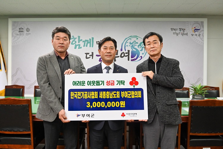 전기공사협회 부여군협의회(회장 김달호)는 최근 부여군청을 방문하여 어려운 이웃을 위해 써달라며 이웃돕기 성금 300만원을 기탁했다.