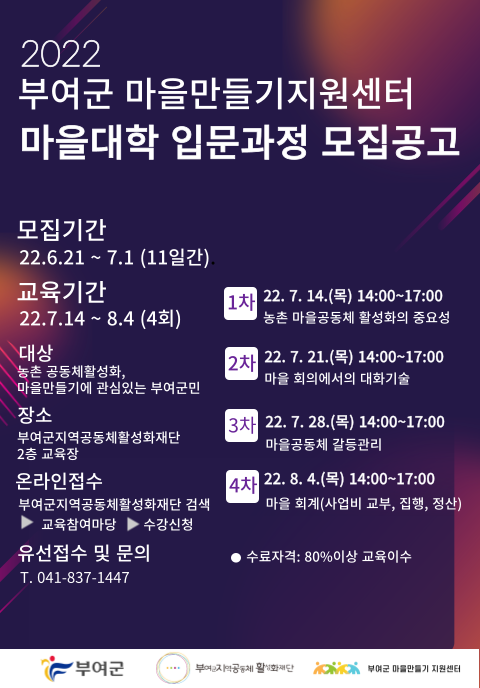 교육에 대한 자세한 문의는 부여군 마을만들기 지원센터(041-830-6848)로 하면 된다.
