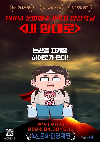 논산문화관광재단(대표이사 지진호)은 4월 30일(화)부터 5월 10일(금)까지 문화예술 기획자 양성학교 <내 맘대로>의 참여팀을 모집한다.