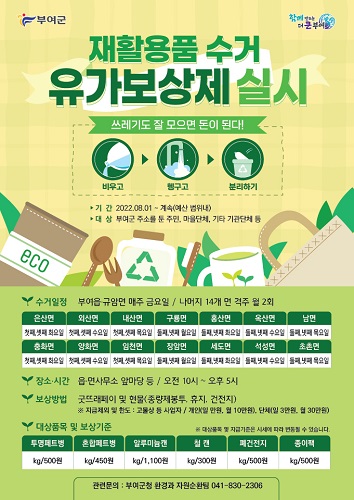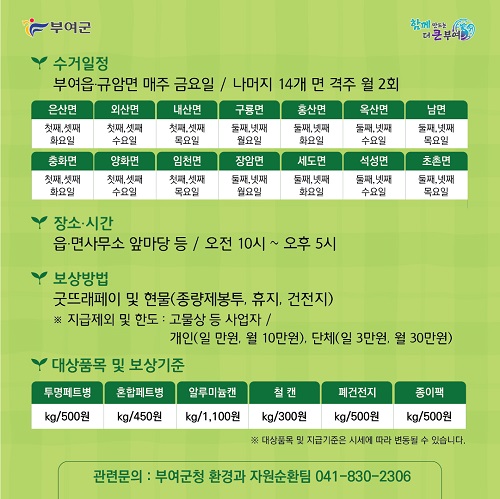 부여군(군수 박정현)은 이달부터 주민참여형 자원순환사업인 ‘재활용품 수집 유가보상제’를 충남 최초로 시행한다.